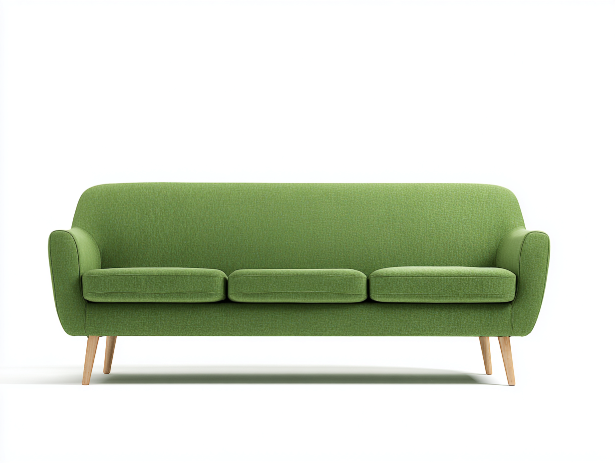 The sofa is upholstered in green fabric with a smooth hand feel and a refined woven texture. The internal structure is supported by a sturdy frame, while the legs are crafted from wood for dependable stability and a natural visual contrast. The seat and back are shaped to create a balanced appearance with comfortable support for daily use.