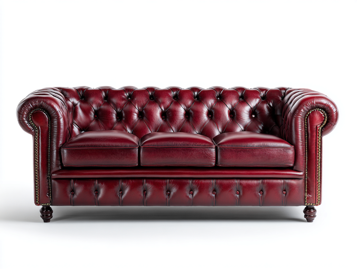 This 3 seater sofa showcases a classic Chesterfield-inspired design with a deep buttoned backrest and rolled armrests, creating a timeless appearance suitable for living rooms, offices, and reception areas. Its solid presence adds character and elegance to traditional and vintage-style interiors.
