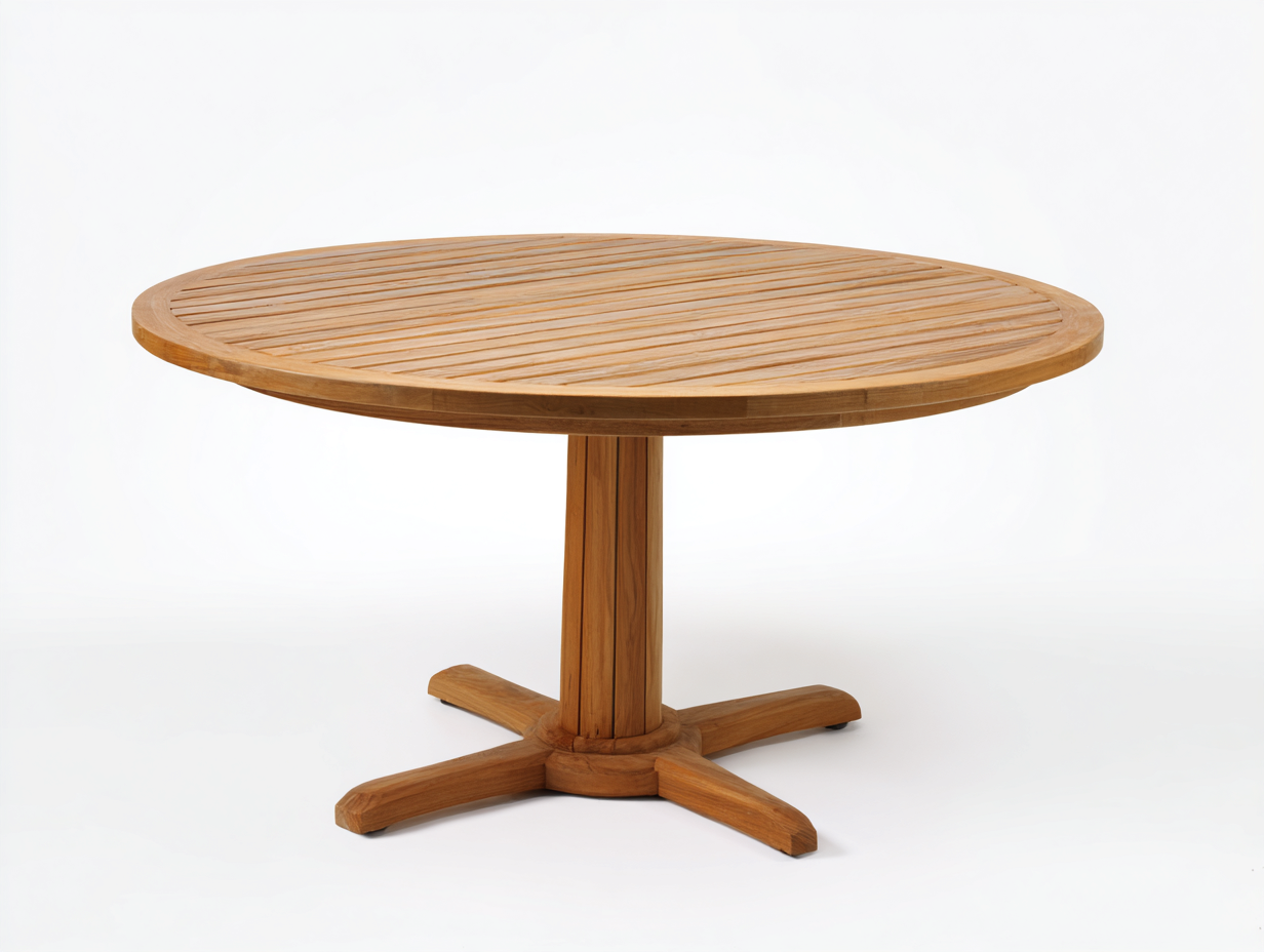 Constructed from solid wood with a brown finish the table presents natural grain textures and a smooth surface. The tabletop uses a slatted design to support airflow and drainage while the pedestal base with cross support ensures stable performance.